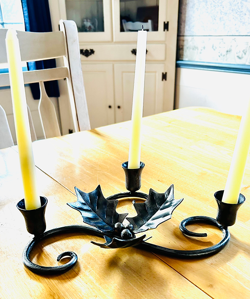 A holiday themed taper candle with holly leaves and berries. Only 1 available for $125. Available to ship.